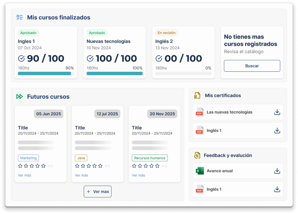 Organiza y ofrece todo tu contenido formativo (interno o externo, SCORM, vídeos, documentos) en un solo lugar accesible.