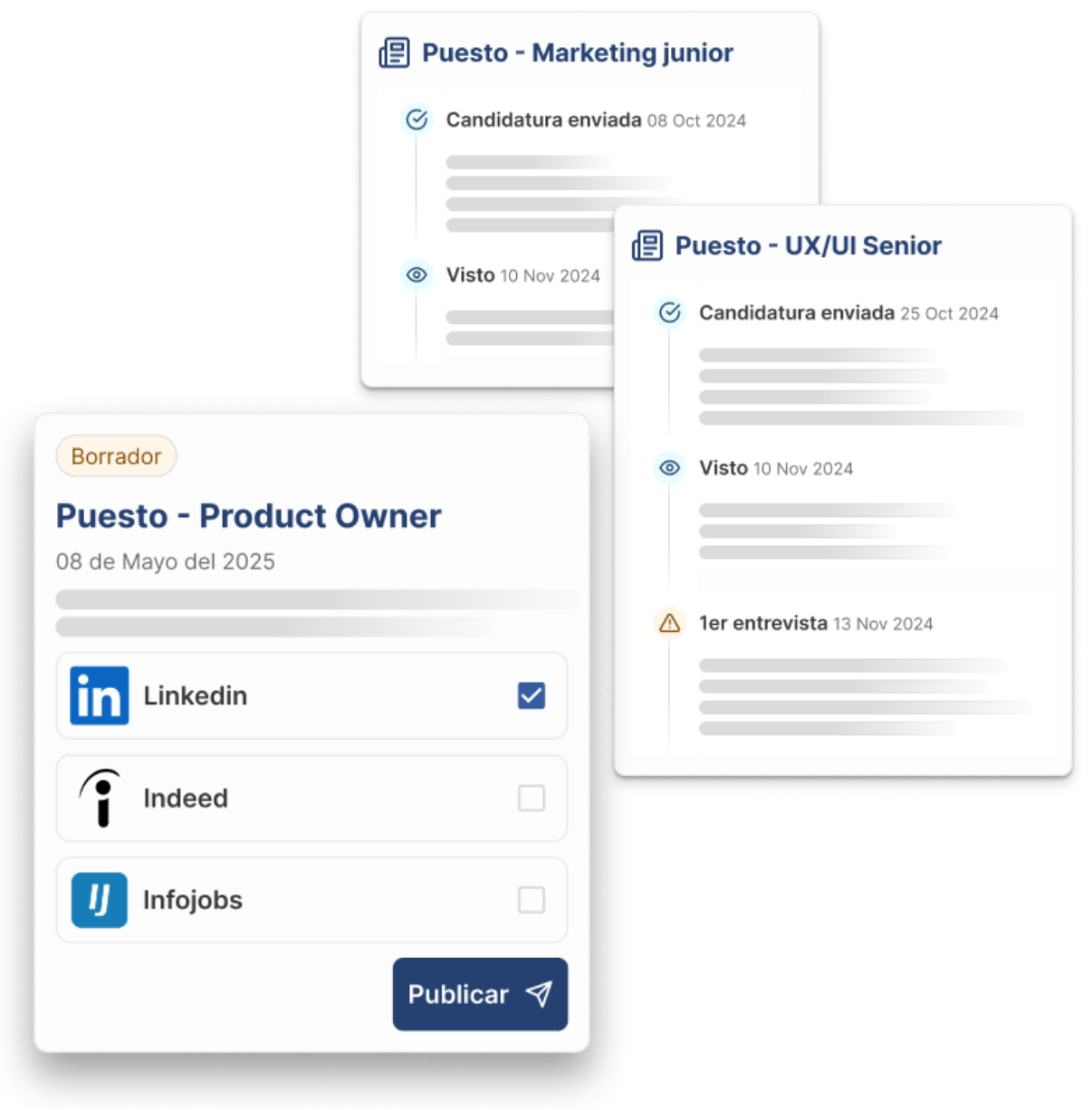 Crea ofertas atractivas y publícalas con un clic en portales de empleo, redes sociales y tu página de carrera. Gestiona también vacantes internas.